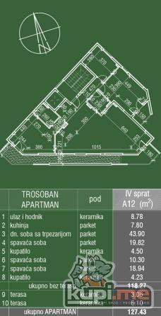 Ovaj trosoban stan se nalazi na cetvrtom I poslednjem spratu zgrade I njegova kvadratura je 128 m2. Struktura stana je velika dnevna soba sa trpezarijom I kuhinjom, tri spavace sobe I dva kupatila. Stan poseduje 2 terase, jedna sa izlazom iz spavace sobe a druga sa izlazom iz dnevne.