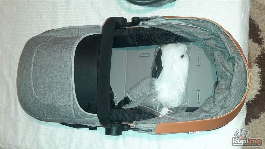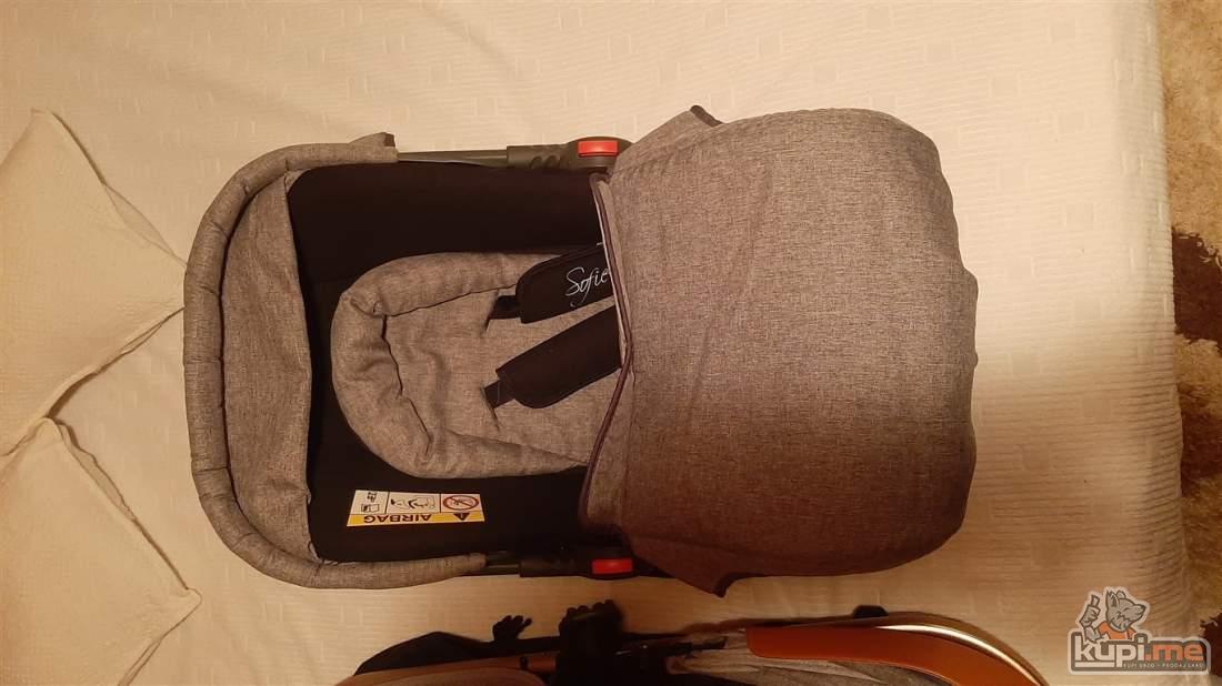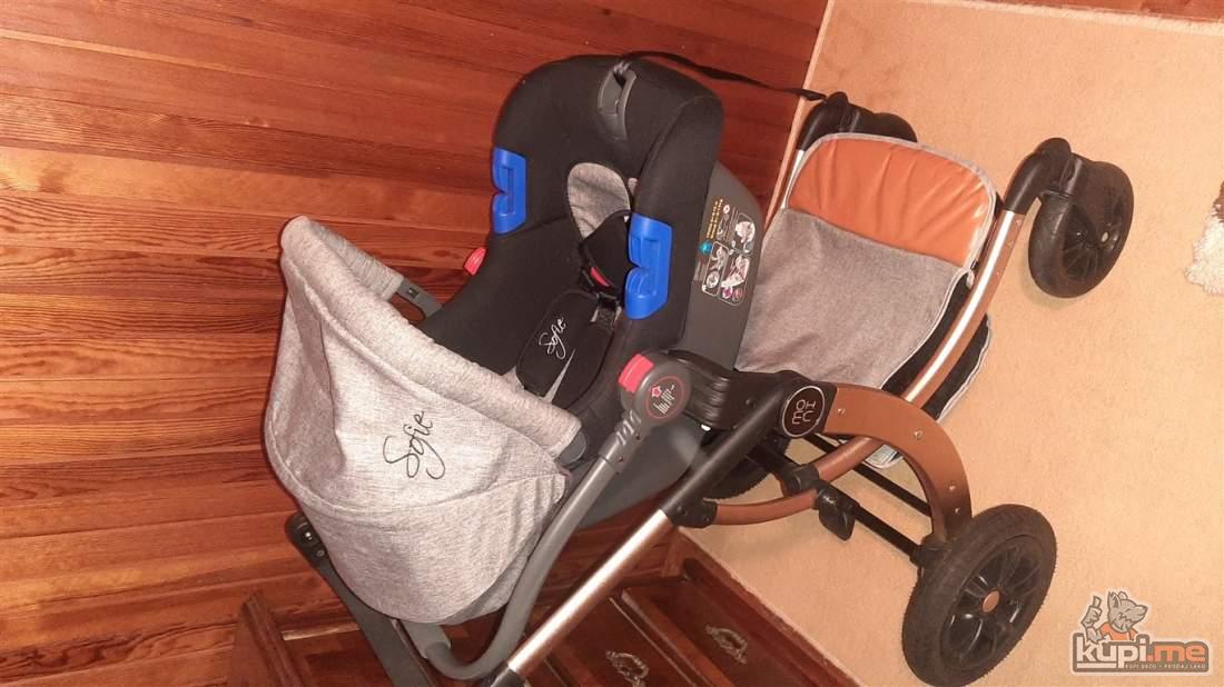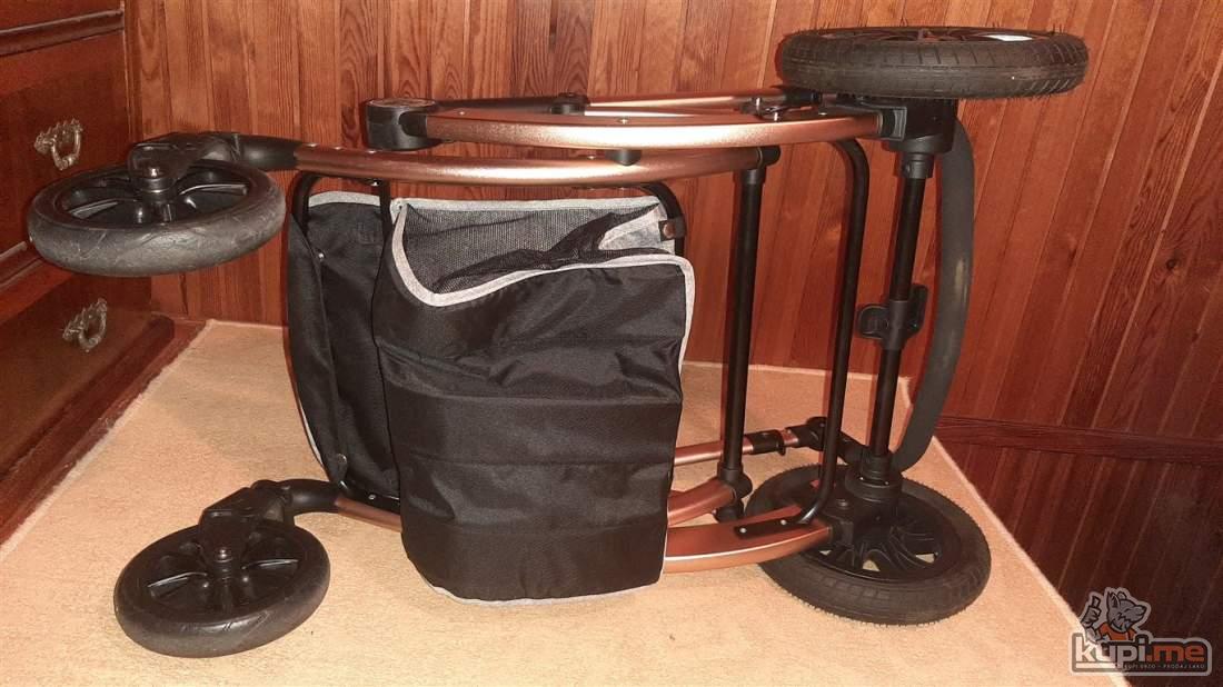 Predvidjena za djecu do 36 mjeseci, konstrukcija napravljena od kvalitetnog aluminijuma, sigurnosni sistem se sastoji od pojasa koji se vezuje u pet tacaka, rucka podesiva po visini, dodatna oprema- navlaka za stopala i torba za pribor, tezina 11,5kg- dimenzija kolica 31x52x90, auto sjediste u istoj boji sa adapterima koje se moze montirati na ram kolica.