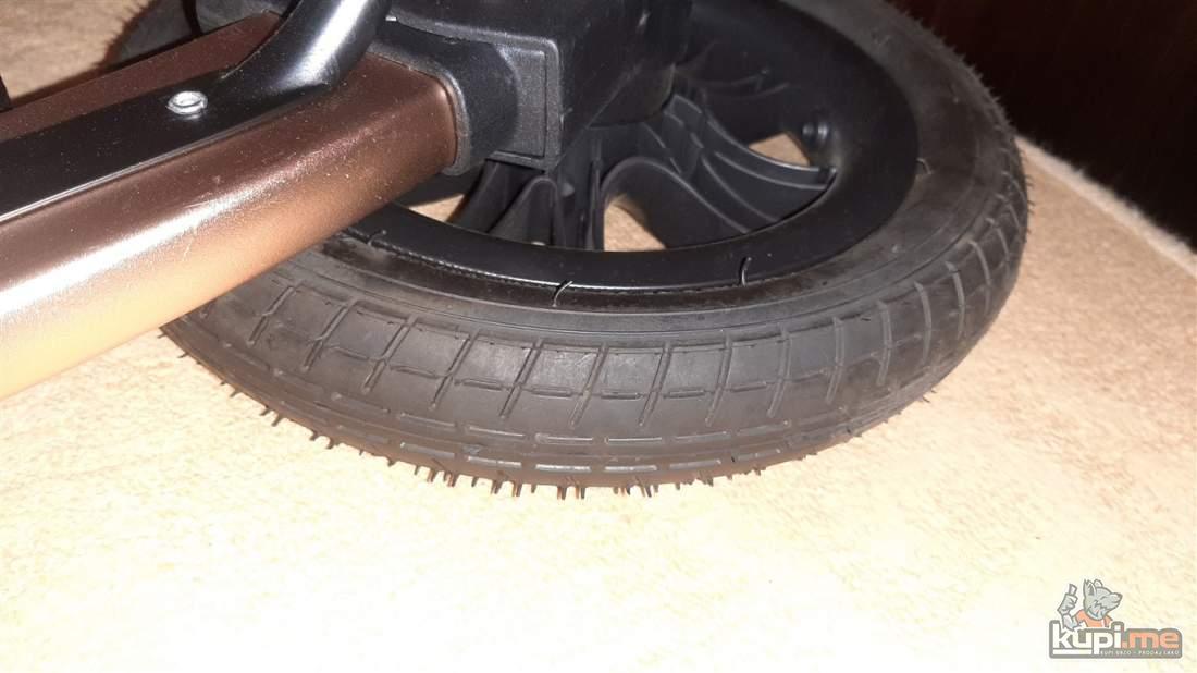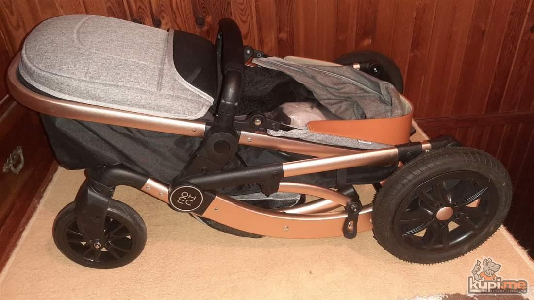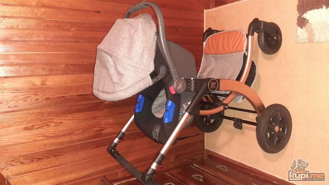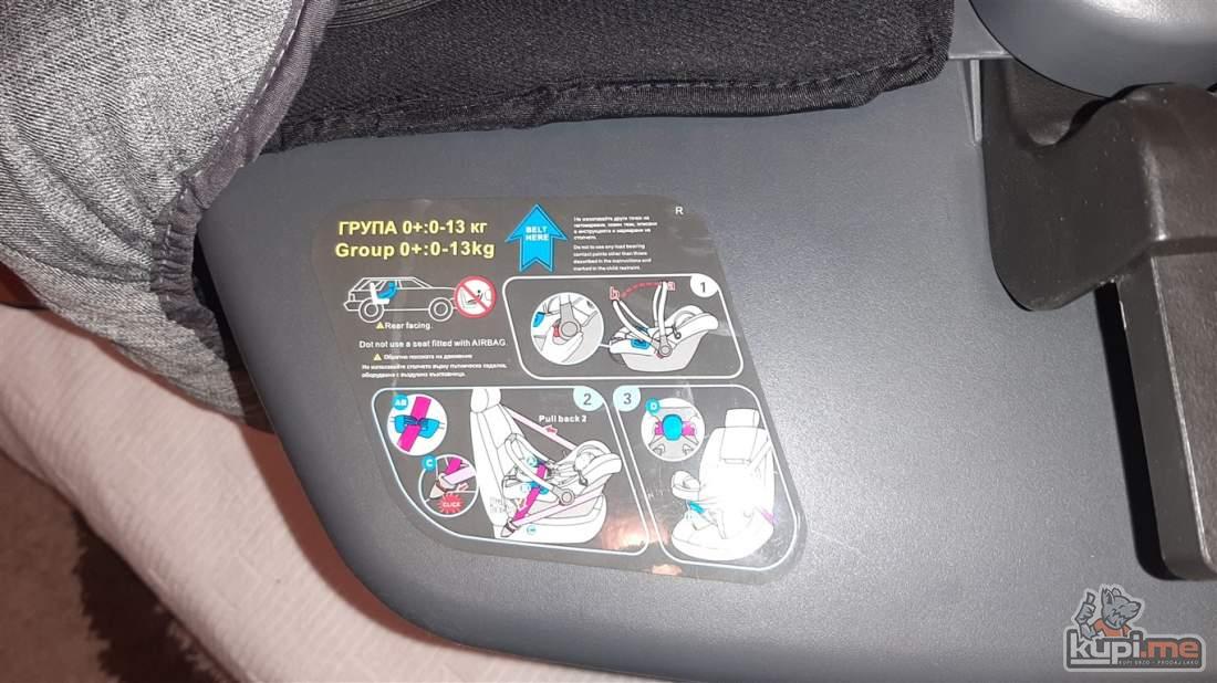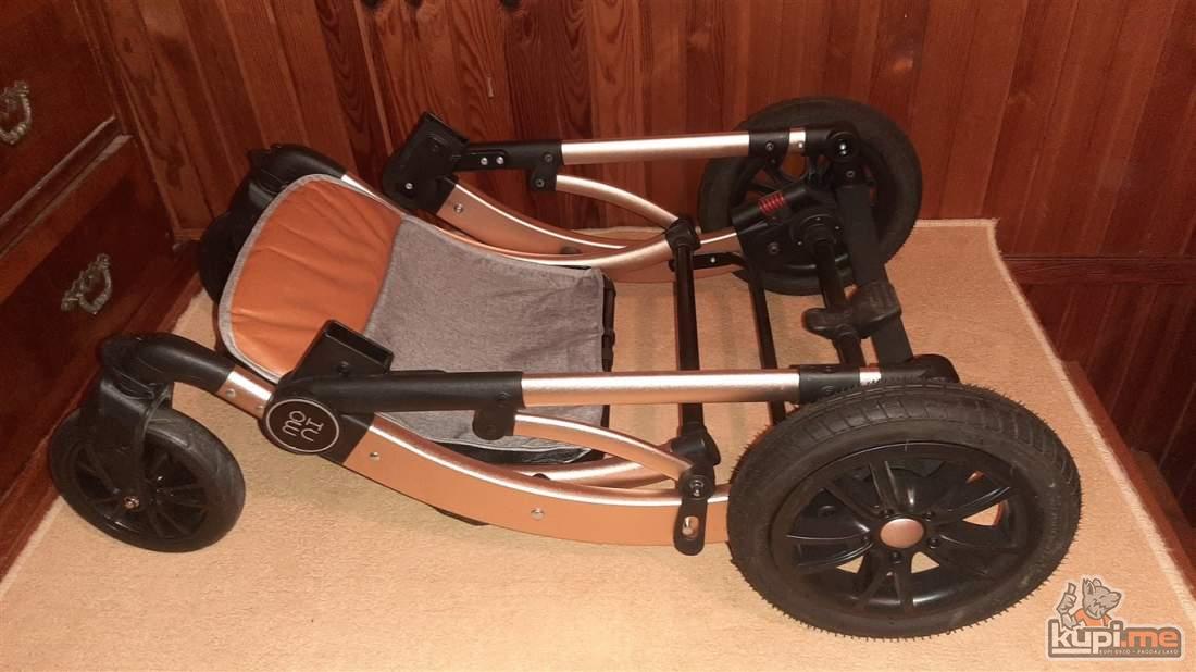 Predvidjena za djecu do 36 mjeseci, konstrukcija napravljena od kvalitetnog aluminijuma, sigurnosni sistem se sastoji od pojasa koji se vezuje u pet tacaka, rucka podesiva po visini, dodatna oprema- navlaka za stopala i torba za pribor, tezina 11,5kg- dimenzija kolica 31x52x90, auto sjediste u istoj boji sa adapterima koje se moze montirati na ram kolica.