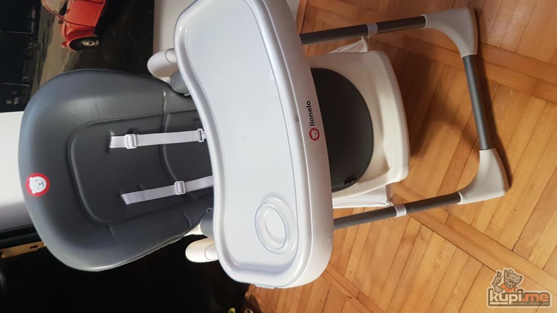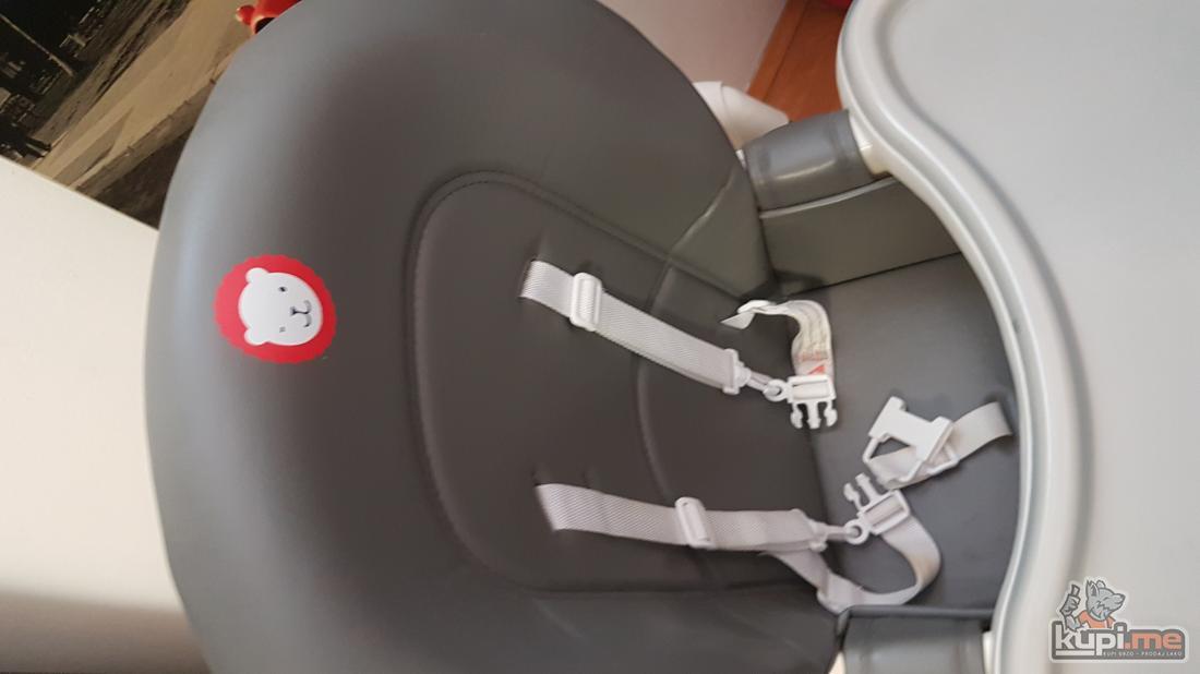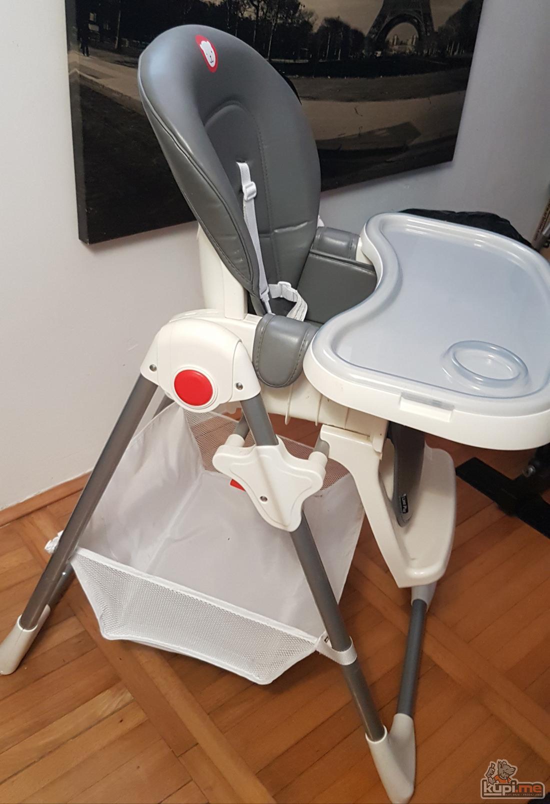Malo koriscena, u odlicnom stanju..Moze se podesiti na 6 nivoa visine, naslov podesiv u 3 pozicije, sjediste lako za odrzavanje, sadrzi 2 uklonjive tacne, manja tacna moze se prati u masini za sudje, maksimalna dozvoljena tezina djeteta 15 kg.Dimenzije hranilice:105×86×55cm